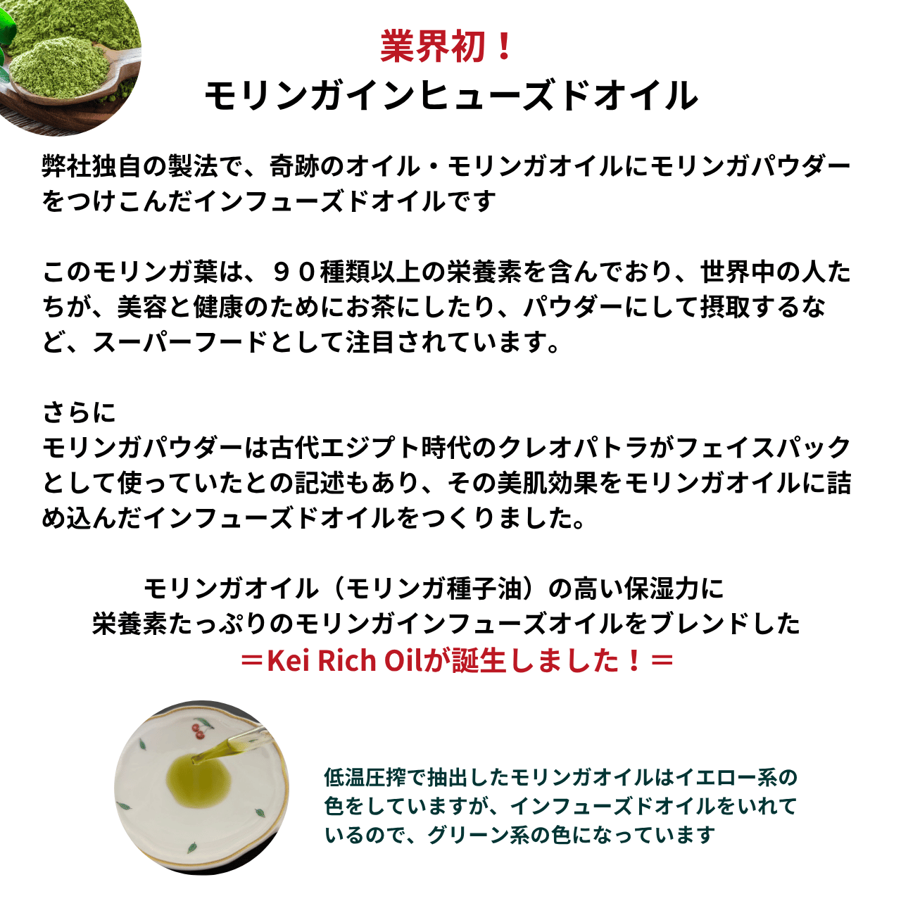 当社独自の製法で作った「モリンガインフューズドオイル」をブレンドしています。